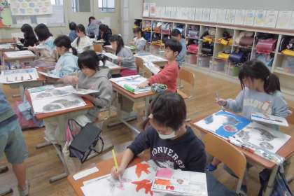 今日は、刷り上げた版画を裏から絵の具で彩色して仕上げました。同じ版から刷った作品でも、色がつくとまた違った印象になり、子どもたちは、真剣に彩色していました。
