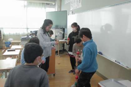 今日の昼休みは、昨日のたてわりタイムで話し合って決めた遊びをしました。教室で遊んだグループは「けん玉」「トランプ」「絵しりとり」などをしていました。