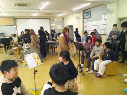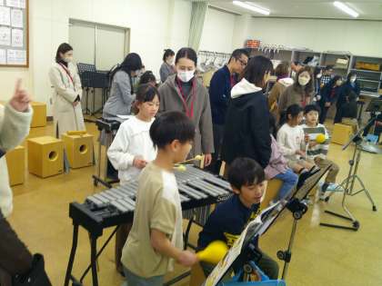 音楽科の学習で、曲に合わせた「まほうの音楽」をグループで考えました。自分たちで聴き取った楽器の音を重ねたり、つないだりして音楽づくりをしています。さまざまな楽器を使い、自分たちの思う「まほうの音楽」を仕上げました。