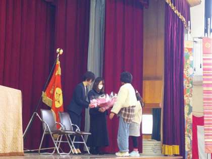 5年生の代表児童が、お礼とお別れの言葉を贈りました。最後に、育友会よりご用意いただいた花束をお渡ししました。