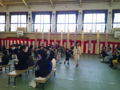 19名の新入生が、ちょっと緊張しながらも元気いっぱいで入学しました。入学式では、校長先生のお話や、担任の先生の紹介やご来賓の紹介をかしこく聞きました。