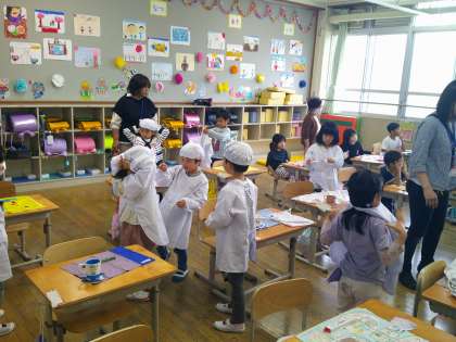 給食当番は、エプロンの準備をします。友だちと確認して、給食室へ出発です。