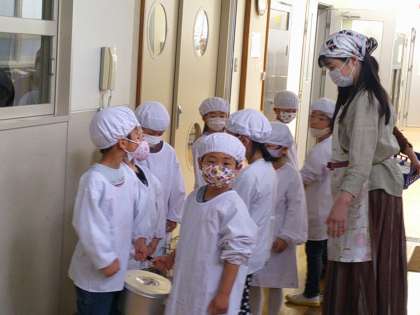 その後、自分が担当する給食を受け取り、お友だちと協力して教室まで運んでいきました。