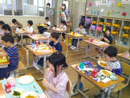 最初の献立は、みんなが大好きな「スパゲティのミートソース煮」です。あと「ほうれん草のソテー」と「りんごゼリー」もあります。