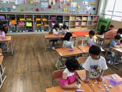 算数に学習で使う数図ブロックを使いました。「どれだけ高く積めるかな〜」と、一人でやった後に、となりのお友だちと二人で積んで楽しみました。