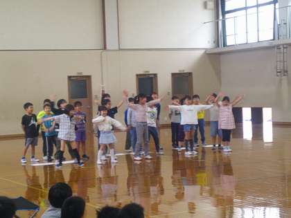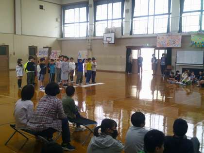 3年生は、「乾隆小学校クイズ」をしました。「乾隆小学校の誕生日はいつでしょう?」「乾隆小学校の部屋の数は?」など、1年生が学校に興味をもってくれるような問題を考えて発表してくれました。その後、「夢をかなえてドラえもん」の替え歌に合わせて、と3年生がノリノリで踊ってくれたので、全校みんなが楽しい時間を過ごしました。