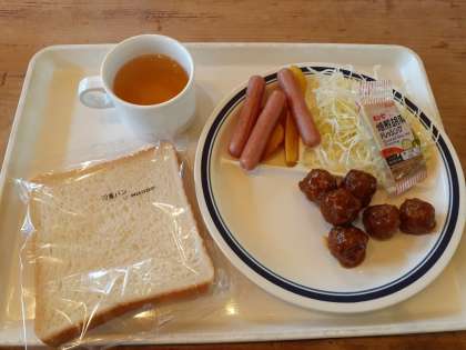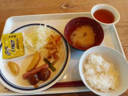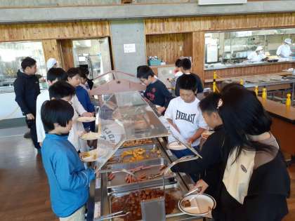 山の家の3回目の食事です。食堂のルールにも慣れ、スムーズです。パンとご飯、スープと味噌汁が選べました。