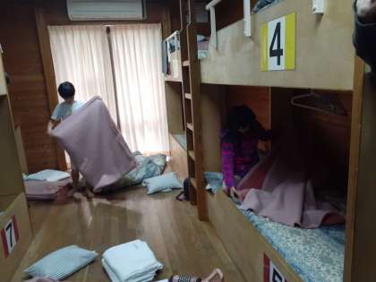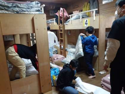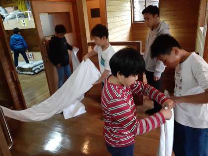 自分たちで使った布団や毛布を、きれいに片づけていきます。