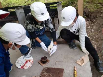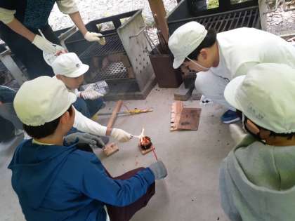 なんとかすべてのグループの火がつき、この火を使って野外炊事が始まります。