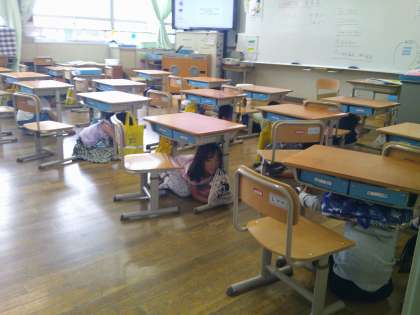 事前指導の後は、訓練を実施します。突然スピーカーから聞こえてきた地鳴りの音に素早く反応し、みんな机の下に体を入れました。大変素早い動きでした。