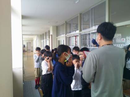 はじめに、各教室で事前指導を行いました。地震が起こったら、まずは身を守ることが大切です。姿勢を低くすることや、倒れてきそうなものから離れることなどを確かめました。