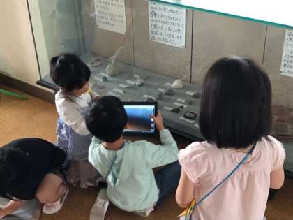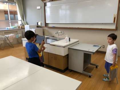 今日は1年生だけでタブレット端末を持って、学校探検に出かけました。どの場所にどんなものがあるのか探してきました。