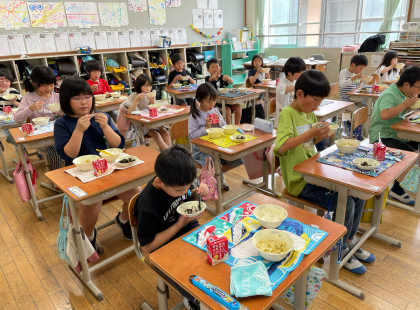 給食・保健委員会の取組の、「給食食べ方ビンゴ」。おいしく行儀よく食べるための取組を、3年生も目標を決めてがんばっています。今日は、「食器を持って食べられた」にスタンプが押せるように日直が意識付けの声かけをしてくれました。今日はしっかり持って食べられました。あと2日で、どれだけビンゴが増やせるでしょうか。