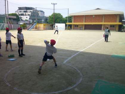 運動場では「ソフトボール投げ」を行いました。