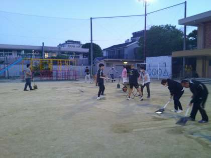 体育振興会、楽童くらぶ、育友会のなど地域の皆様が学校集まってくださり、学校のはだしの生活のために運動場の小石をさらってくださいました。