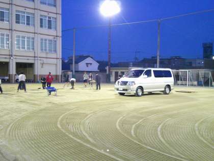 シャベルで運動場の土をさらい、ふるいにかけて小石を取り除く作業をし、その後、車につけたトンボで運動場をきれいに整えてくださいました。