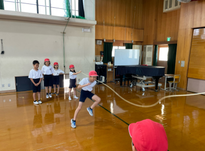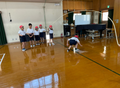 毎週水曜日の「朝トレ」では、様々なトレーニングを朝学習の10分間を使って行っています。今回は大繩の八の字跳び。「1、2の、3!」と友だちと声をかけながら跳んでいました。八の字が苦手でも、勇気を出して挑戦する姿が見られました。