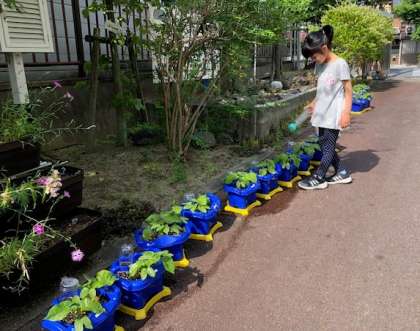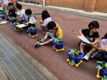 生活科であさがおを育てています。自分の植木鉢に芽が出てきてうれしそうに絵にかいています。お水やりも「早くおおきくなってほしい」と毎日取り組んでいます。