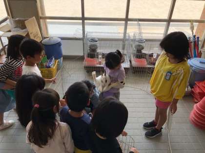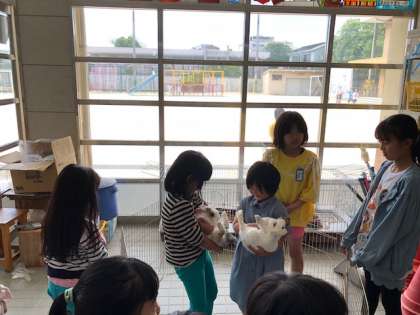 委員会の取り組みで飼育園芸委員会の5・6年生がウサギのふれあいの時間を作ってくれました。1年生は大喜びでした。