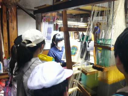 昨年度、手機織体験をしている子どもたちですが、繊細な手機の西陣織の織物に、とても驚いている様子でした。