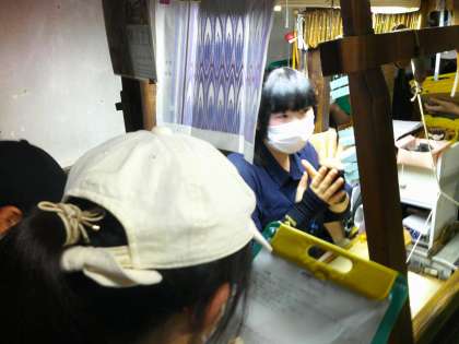 はじめに、「手機」の見学をさせていただきました。手機の織機のしくみや、経糸が何本通っているのかを教えていただいたり、実際に織られる様子や織られたものを見学させていただいたりしました。