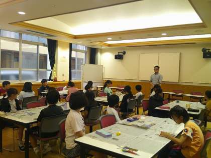乾隆小学校では、4〜6年生の子どもたちが「幡の学習」に取り組んでいますが、4年生では、西陣織の生地を使って「しおりづくり」に取り組みます。幡の先生から、しおりづくりの手順を教わりました。真剣な表情で聞いています。