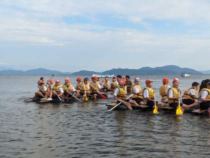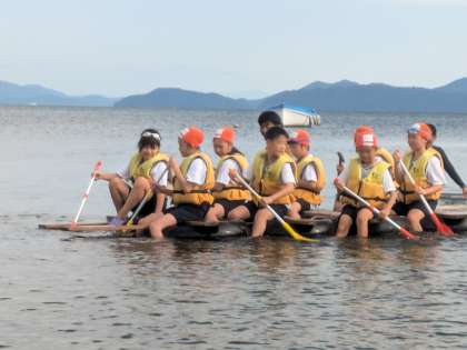 曇り空だったお天気も良くなってきて、みんなで協力していかだを漕ぎ、湖上でのいかだ体験を楽しみました。