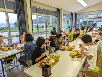 夕食の時間です。学校のランチルームより広い食堂に集まり、みんなでおいしく食べました。