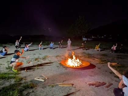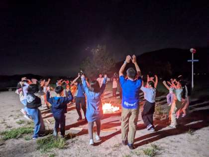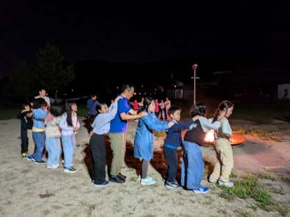 キャンプファイヤーは事前に学校で少し練習もしましたが、実際に火を囲んでおこなうキャンプファイヤーとは大違いです。