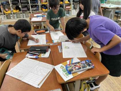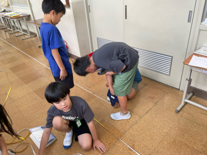 算数科の「長さ」の学習では、教室の縦や横の長さや、廊下の長さを測りました。今まで使っていた30cmものさしや1mものさしではなく、巻尺を使うと長いものや曲がっているものの長さを測るのに便利なことに気付けました。
