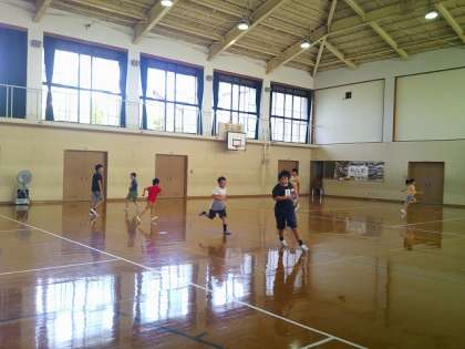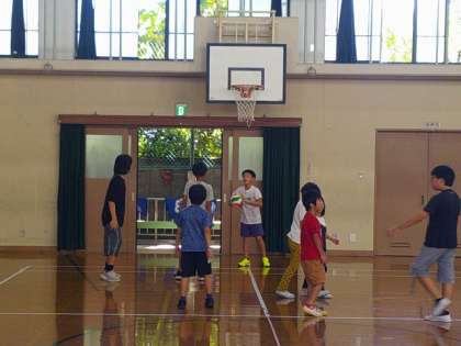 体育館では、だるまさんがころんだ、線おに、バスケットボールを楽しんでいます。
