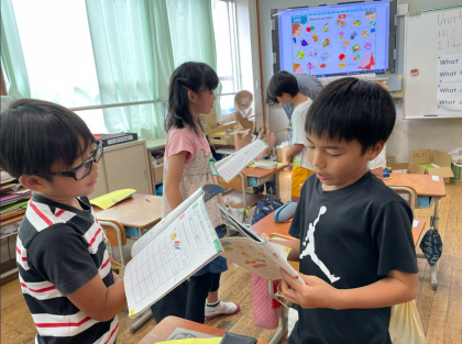 「What do you like?」の学習で、自分の好きな色や食べ物、スポーツを伝えながら、相手に好きなものを聞くという学習をしました。友だちにも、ALTのケー先生にもどんどん話しかけている3年生。歩き回って質問し、友だちやケー先生の好きなものを知ることができました。