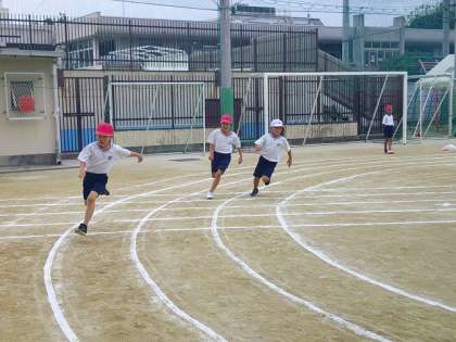 2年生は、80メートル走です。距離も少し長くなり、カーブも気をつけて走っていました。
