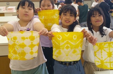 きれいな黄色に染まりました。輪ゴムをほどくと、いろいろな模様があらわれました。自分だけの、とっておきのハンカチのできあがりです。