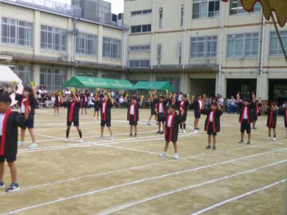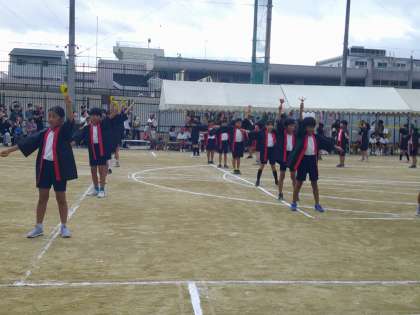 はっぴを着て、鳴子を持って元気いっぱい運動場に飛び出しました。堂々と踊ります!
