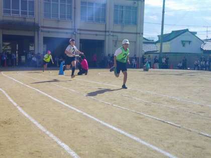 5・6年生は一人がトラック1周を走ります。堂々と入場し、スタートです!