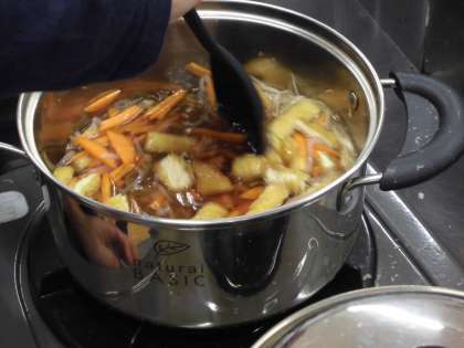 だしの入った鍋に調味料を入れ、野菜などを入れて煮立たせていきます。