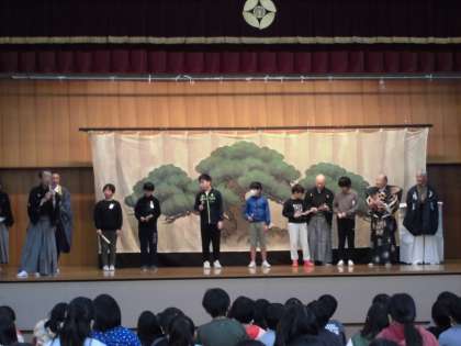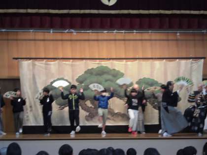 演目中に、太郎冠者と山伏が歌いながら踊っていたものです。舞台に上がった代表児童が踊っている時には、客席にいる子どもたちはでんでん虫の歌を歌い、会場中が一体となった楽しい時間でした。