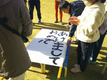 門松ができあがると、看板作りです。全員が一文字は書きました。風が強くて、墨液が飛んでしまったハプニングもありましたが、それも心に残る思い出です。文字の周りにお正月らしい絵を描いて仕上げます。