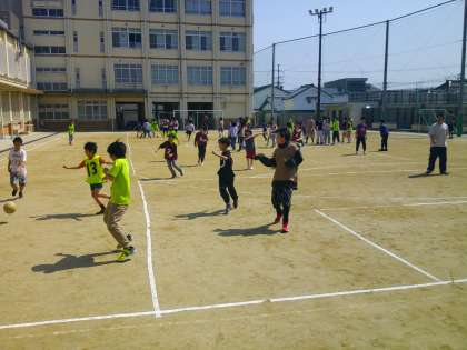 バスケットボールが終わると、運動場に出てサッカーです。子ども達は2チームに分かれて全員参加です。ボールを2つ使い、あちこちでパスやシュートが繰り広げられました。サッカーの最後は、部活動でサッカーをしている子ども達と大人との対戦もありました。