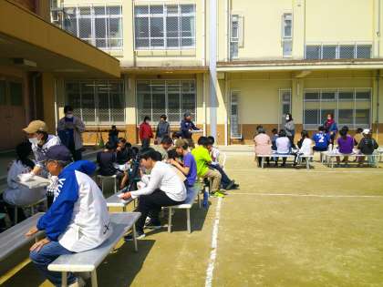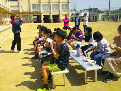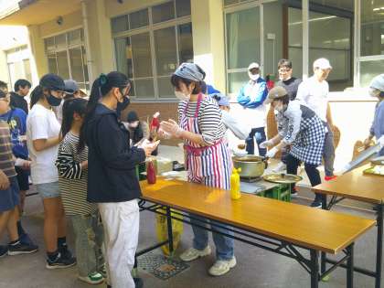 しっかり体を動かした後は、おいしいホットドッグとビーフシチューをいただきました。早くからいい匂いがしていて、おなかがすいていました。青空の下で食べるのは最高でした。