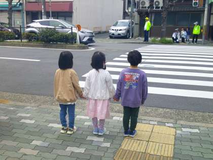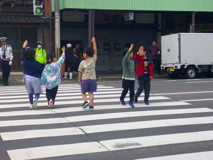 信号のない道路の渡り方や、信号のある道路の渡り方のお話を聞いた後、通用門から出て、千本通りを横断しました。教えていただいことを守って、信号をよく見て、車や自転車の通行をよく見て、安全にわたることができました。