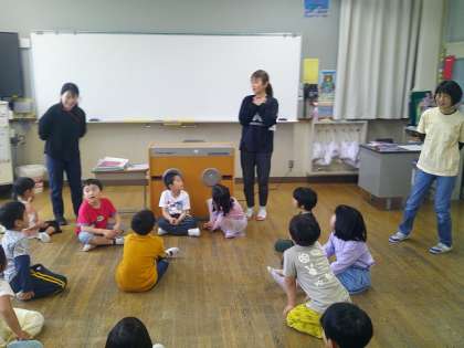 今日の朝学習の時間には、乾隆幼稚園の先生方にお越しいただきて、歌に合わせて自己紹介したり、自分の好きな物について言ったりする活動をしました。みんなとても楽しそうに活動に参加していました。