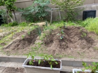 生活単元学習の時間に、コスモス畑で育てたい夏野菜について考えました。今日、コスモス畑に肥料をまいてから畝を作り、夏野菜の苗植えをしました。今年は、トウモロコシ、パプリカ、トマト、ナスを育てます。今後の生長が楽しみです。