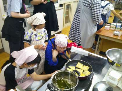 パタパタおにぎりは、油揚げの中に卵を割り入れて焼きます。グループで協力しないとできません。みんなで力を合わせて調理していきます。火加減も気を付けながら卵入り油揚げを焼いていきます!