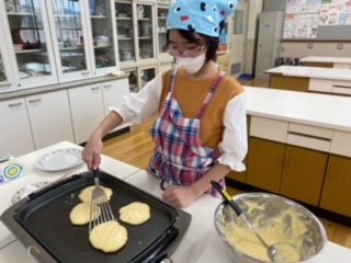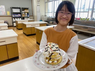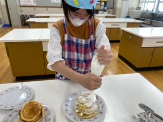 ホットケーキの生地ができると、ホットプレートを使って、ホットケーキを焼きました。昨年度学習したことを生かしながら調理することができました。そして、自分がイメージするお誕生日ホットケーキタワーになるよう、生クリームでデコレーションし、カラースプレーなどの飾りをつけて、完成です!自分がイメージしたケーキとなり、美味しいケーキができて嬉しそうでした!片付けも進んで行うことができました。
