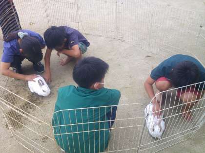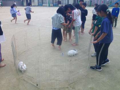 今年度から、委員会活動を4年生以上で取り組んでいます。今日は4年生と5年生の園芸・飼育委員が、4年生にうさぎのふれあい体験をしてくれました。久しぶりに外に出たうさぎたちは、ちょっと緊張しているようでしたが、おとなしく子ども達を受け入れてくれていました。4年生以上の子ども達も、委員会活動の仕事にも慣れ、自信をもって日々の活動をしている姿が頼もしいです。