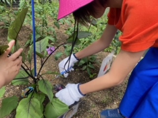 コスモス畑で育てている夏野菜の1回目の収穫を行いました。畑の土が乾くと水をやり、追肥を行ってきたので、立派なナスを収穫することができました。他に育てているトウモロコシやトマト、パプリカも順調に生長しており、今後の収穫と調理が楽しみです!
