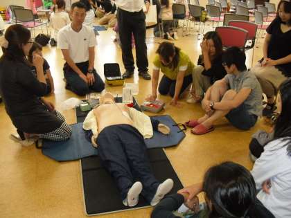 後半は,上京消防署の方が2名来ていただいて,心肺蘇生法の実地訓練と