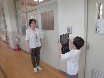 1年生の生活科『がっこうたんけん』の学習の一環として、子どもたちはGIGA端末を持って、休み時間にインタビューに回りました。
